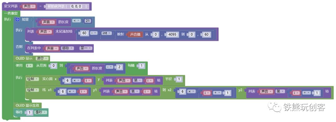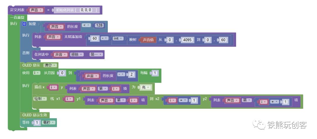 然后不断去读取声音的值,然后添加到“声音”列表中。这个过程中还要去检测“声音”列表中的数据量是否多于 128 了,因为数据太多,显示屏也一样是画不下的,所以当数据太多的时候,不断去移除列表前面的数据,让列表中的数据进行移动,这样在绘图的过程中,就可以形成动态的效果啦。
