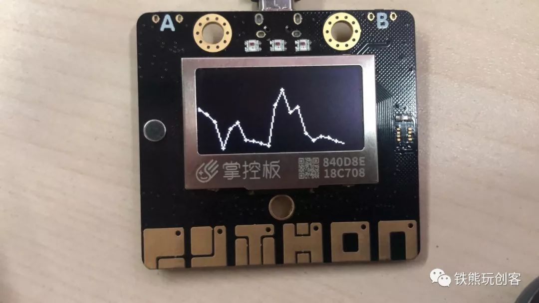 绘图时,会用到一些坐标知识,尤其是绘制线条的过程,它要将前一个点和后一个点连接起来,横坐标很容易处理,就是 “i” 和 “i+1”,纵坐标就是声音列表相应位置的声音值。这里有一个需要注意的地方是,绘图时用了“使用i从范围……”这条重复执行语句,它的起始点设置为 0 容易理解,但是终点为什么设置为“声音列表的长度-2”呢?这是因为如果设置为“声音列表的长度-1”(或者“声音列表的长度”),那么最后一项(或2项)会溢出列表,因为列表是从 0 开始计数的。理解了这些之后,就是让掌控板显示曲线了。