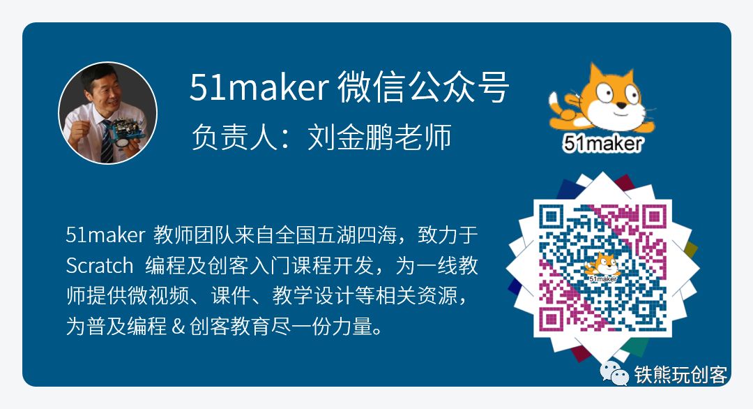 51maker 是由一群教师团队维护的微信公众号,他们来自全国五湖四海,致力于 Scratch 编程及创客入门课程开发,为一线教师提供微视频、课件、教学设计等相关资源,为普及编程 & 创客教育尽一份力量。