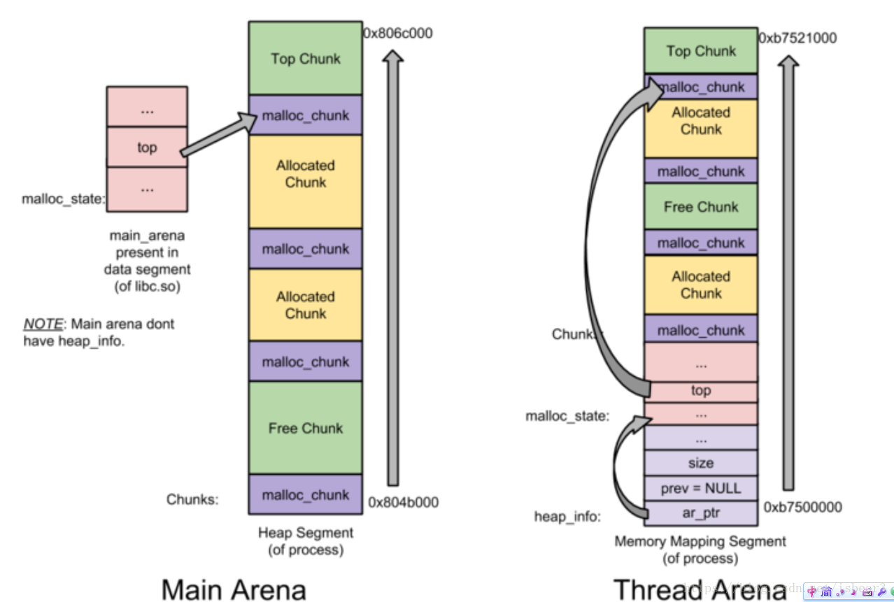 2.一个arena可以维护多个堆,但只维护一个malloc_state(即Arena Header) (main arena没有heap_info)