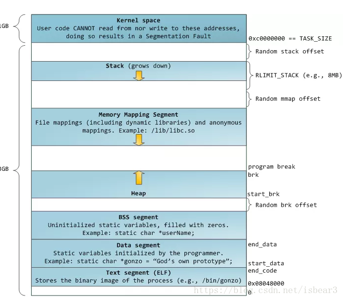 start_brk 是堆的起始,brk是堆的终止。如果打开aslr时,会在start_brk(在.bss端段)前加入一段随机的偏移