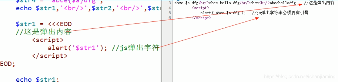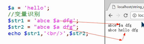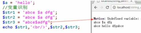 上图代码清晰显示单引号、双引号字符串区别。即双引号可以解析$变量。