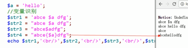 例如上图代码str3中双引号中出现的是$adfg而不是$a。所以系统报错没有定义$adfg。而str2中系统可以轻易区分$a,因此得以正确解析变量。