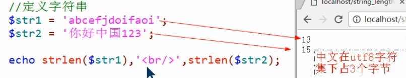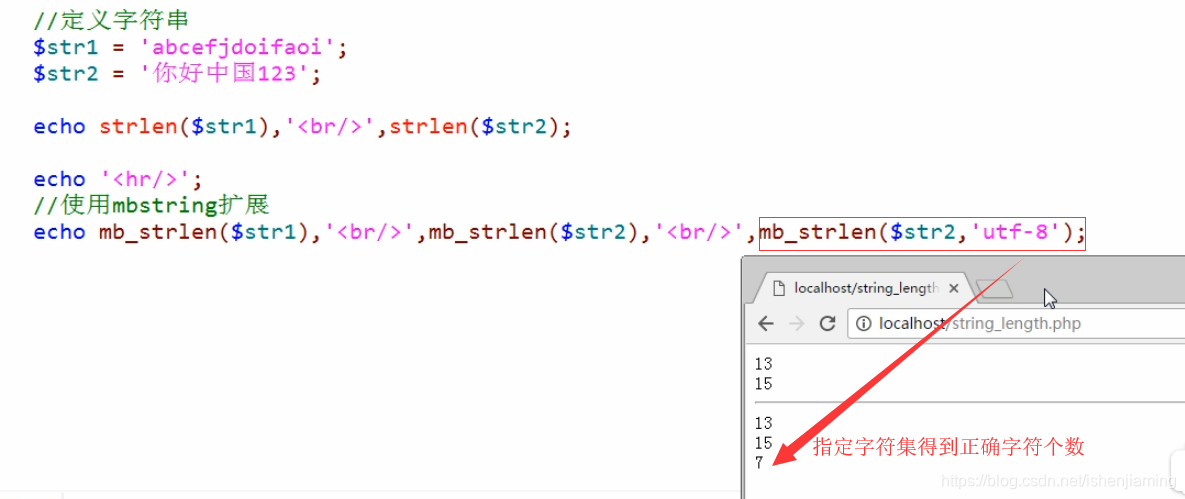 注意:使用mb_strlen必须指定字符集'utf-8'以获取中文正确的字符个数。如果不指定,默认是英文字符集(ascii),那么效果就和strlen函数一样了。效果如上图演示代码。