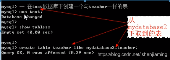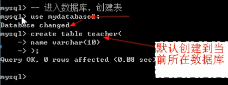 以上代码首先使用use语句选择数据库mydatabase2,然后在默认数据库(即mydatabase2数据库)中创建表teacher.