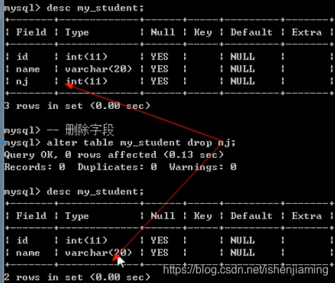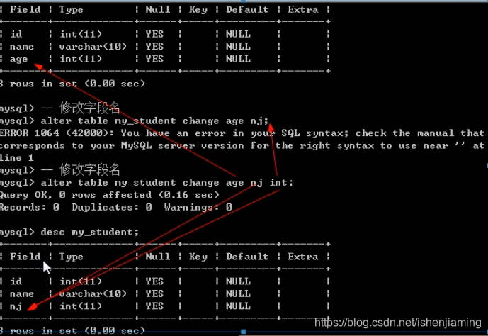 如上代码,修改字段名时必须指定字段类型,否则会出错而修改失败!