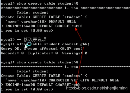 - 修改已有表的字符集:alter table 表名 charset=utf8;
