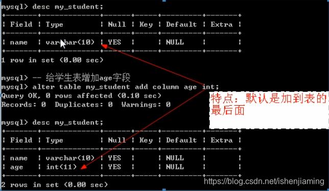 alter table 表名 add [column] 新字段名 列类型 [列属性] [位置 first/after 字段名]
