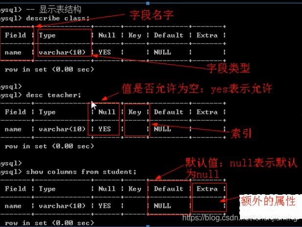 本质含义:显示表中所有字段信息(名字,类型,属性等)