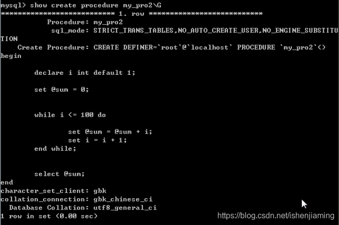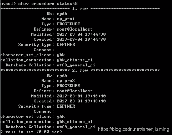 - 查看全部存储过程: show procedure status [like 'pattern'];