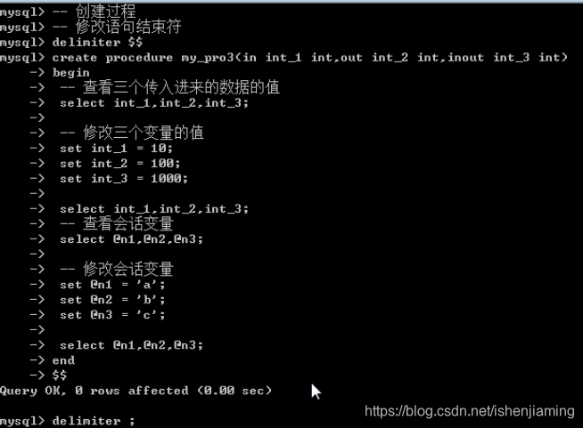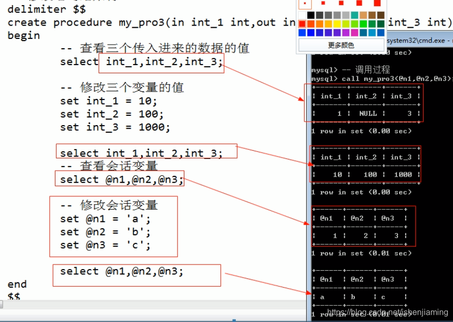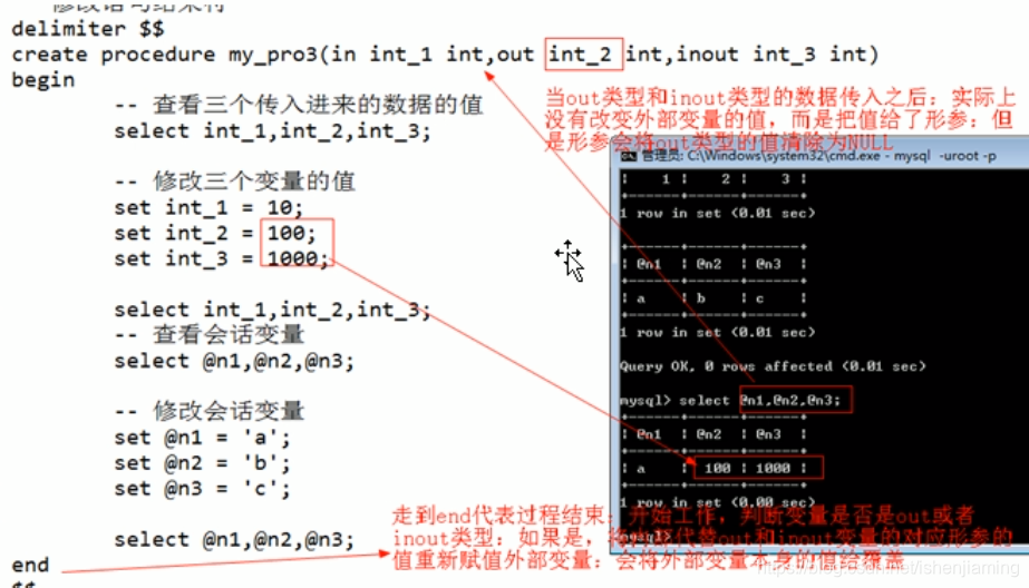 而形参int_2(out类型), int_3(inout类型)对应的实参变量为@n2,@n3.因此@n2为100,@n3为1000.