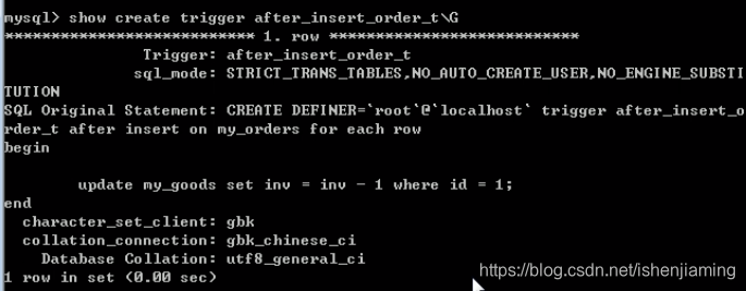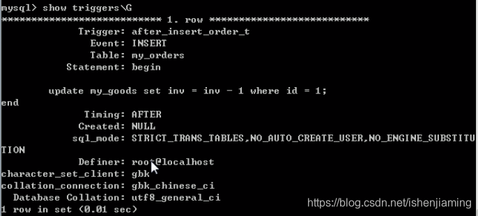 - 2. 查看触发器创建语句: show create trigger 触发器名字;