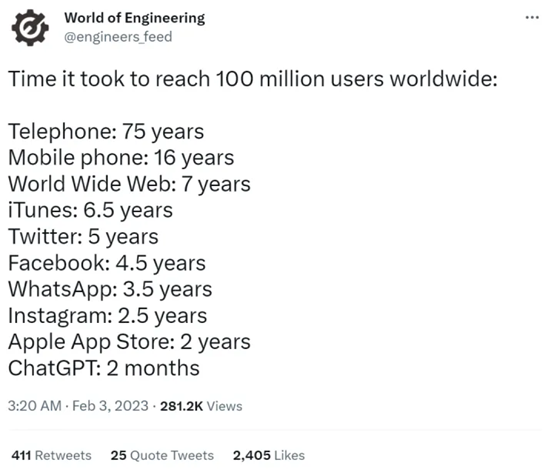 ChatGPT横空出世直接霸屏各大平台热搜榜单,刷爆朋友圈,引发全球ChatGPT概念股集体疯涨。ChatGPT推出仅2个月,它的活跃用户已破1个亿,在1月份的访问量约为5.9亿。成为史上用户增长速度最快的消费级应用程序。