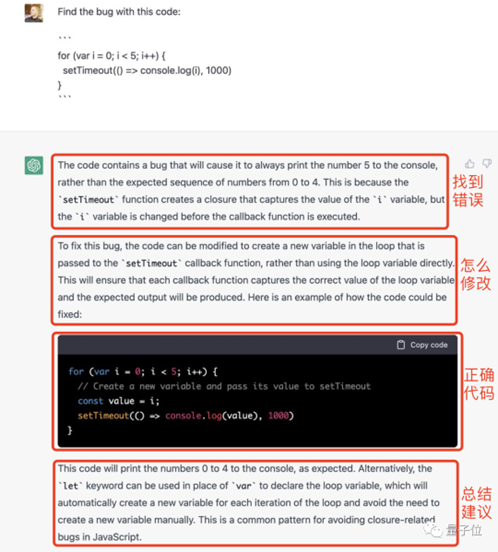 此前,EPIT的CEO给ChatGPT一段有错误的代码,让它找出其中的Bug。结果ChatGPT不仅把Bug找出来了,还指出了错误原因,怎么修改,并且还附上了正确代码,最后还不忘来一波总结。