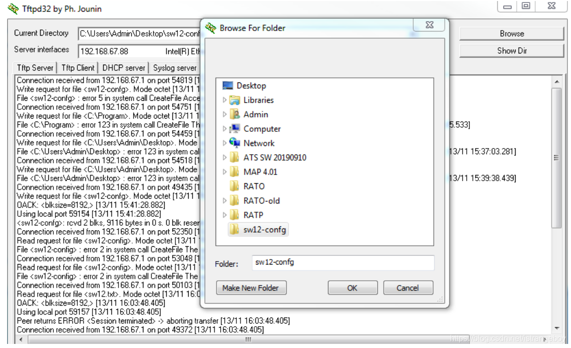 第四步:创建一个名为sw12-confg的文件夹打开,tftp软件,选择前面改好ip对应的网卡(如:192.168.67.88),在Browse中选中创建的文件夹,并打开Logview查看实时传输状态;