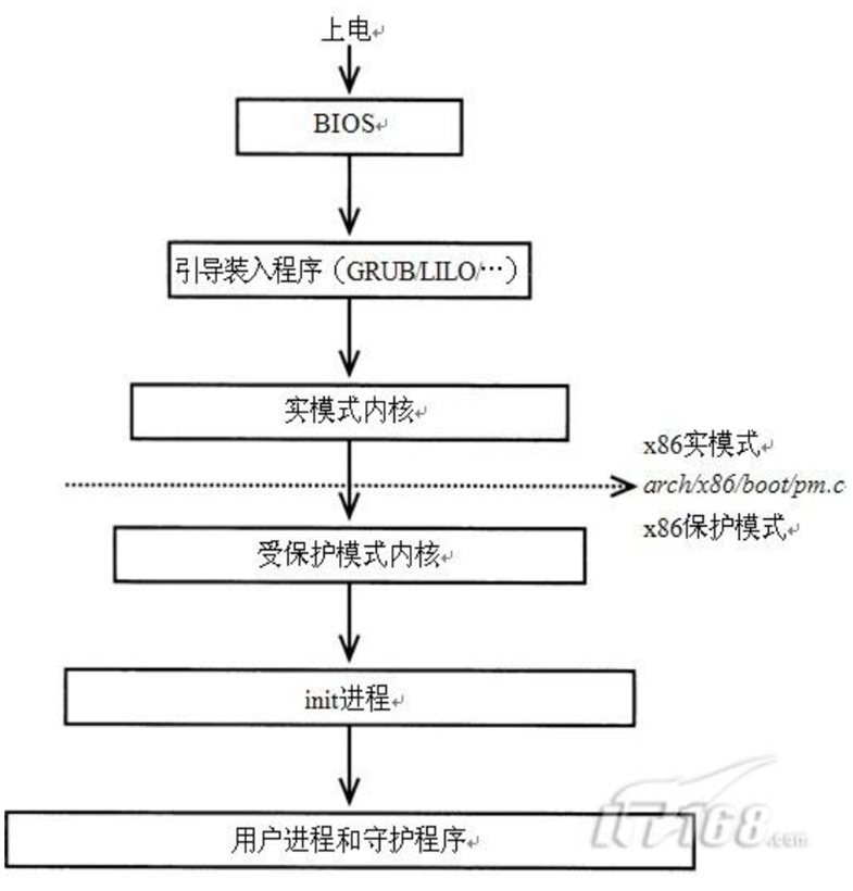 此段为Linux引导。Linux的引导装入程序通常会给内核传递一个命令行。命令行中的参数类似于传递给C程序中main()函数的argv[]列表,唯一的不同在于它们是传递给内核的。可以在引导装入程序的配置文件中增加命令行参数,当然,也可以在运行过程中修改引导装入程序的提示行[1]。如果使用的是GRUB这个引导装入程序,由于发行版本的不同,其配置文件可能是/boot/grub/grub.conf或者是/boot/grub/menu.lst。如果使用的是LILO,配置文件为/etc/lilo.conf。