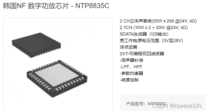 总体来说韩国NTP8835C应用在OLED/UHD/FHD电视或监视器电视,系泊部位,迷你组件音频解决方案都有不错的效果性价比这方面是大多数国内首选之一,想要了解更多韩国NF系列的朋友可联系isweek工采网。