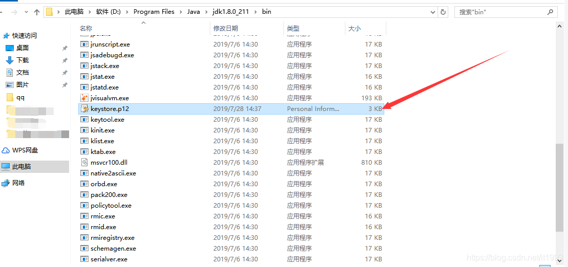 输入密钥,待会在程序中会用到,名称姓氏、组织代为等直接回车,最后是否正确,填写字母y就可以了,大功告成,此时去JDK安装目录bin下 ,可以看到咱们生产的密钥文件了