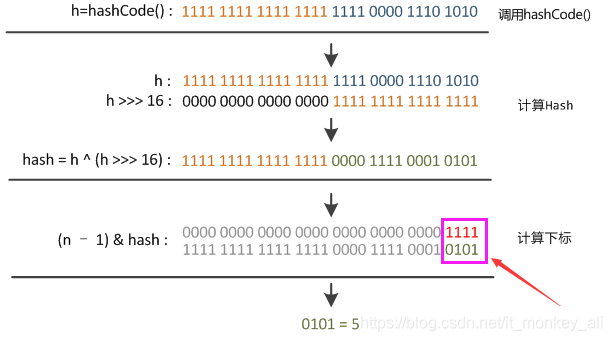 从上面的代码可以看到key的hash值的计算方法。key的hash值高16位不变,低16位与高16位异或作为key的最终hash值。(h >>> 16,表示无符号右移16位,高位补0,任何数跟0异或都是其本身,因此key的hash值高16位不变。)