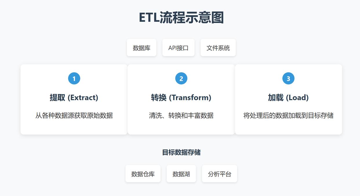 抽取(Extract):从异构数据源(数据库、API、文件等)获取原始数据