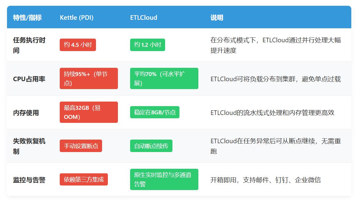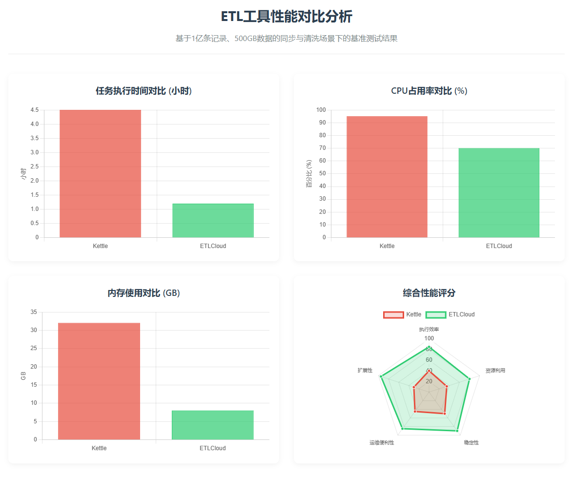 为了更直观地对比,我们在一个包含1亿条记录、约500GB数据的同步与清洗场景下,对Kettle和ETLCloud进行了基准测试,关键指标对比如下: