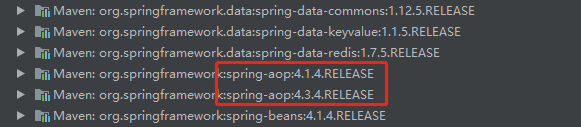 原来项目仓库中有两个版本的 spring-aop 依赖。项目原本引入的 spring-aop 是 4.1.4.RELEASE,引入别的团队的 jar 包后,又附带引入了 4.3.4.RELEASE 版本的 spring-aop,所以 jar 包冲突报错了。