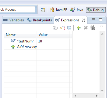 按Ctrl+Shift+D或者Ctrl+Shift+I来显示选定变量或者表达式的值。我们也可以给一个变量或表达式添加永久观察点,当程序在调试时,这些观察点就会在表达式视图(Expression view)中显示出来。