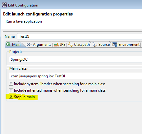 在运行/调试设置中,编辑配置对话框中有“Main”这个选项卡,我们可以勾选“Stop in main”这个复选框。如果选中,那么在调试一个基于main方法的Java程序时,程序会在main方法第一行位置便停止执行。