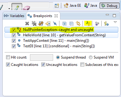 在断点视图中,有一个J!标记按钮!我们可以使用该按钮来添加一个Java异常断点。例如,我们想让程序在遇到空指针异常(NullPointerException)时,仍然能继续调试,那么我们可以使用该按钮来添加一个异常断点!