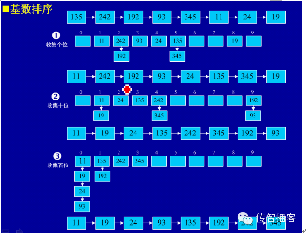 (1)基本思想:将所有待比较数值(正整数)统一为同样的数位长度,数位较短的数前面补零。然后,从最低位开始,依次进行一次排序。这样从最低位排序一直到最高位排序完成以后,数列就变成一个有序序列。