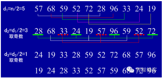 (1)基本思想:算法先将要排序的一组数按某个增量d(n/2,n为要排序数的个数)分成若干组,每组中记录的下标相差d.对每组中全部元素进行直接插入排序,然后再用一个较小的增量(d/2)对它进行分组,在每组中再进行直接插入排序。当增量减到1时,进行直接插入排序后,排序完成。