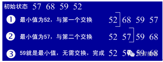 然后在剩下的数当中再找最小的与第二个位置的数交换,如此循环到倒数第二个数和最后一个数比较为止。