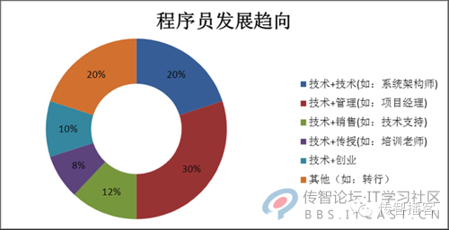 程序员发展主要有分为走业务+技术方向、管理+技术,或选择纯粹钻研技术方向。一般,程序员都会经历几条路:程序员→系统分析员→技术经理→CTO,程序员→项目组长→项目经理→项目总监,程序员→产品设计师→产品经理→CTO。小编对随机抽样的1000名样本对自己未来职业规划进行调查,发现超过30%的程序员发展方向是技术+管理。