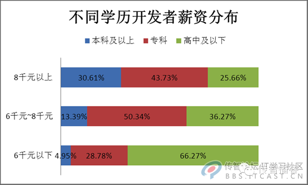 IT行业的薪资让人如此羡慕,难道只有高学历才能成就高工资呢? 2014年开发者生存调研报告再次给出了否定答案。报告指出,参与调研的1000名样本中,高中及以下学历占比为9.8%,平均薪资为6234.28元;专科学历占比为21.2%,平均薪资为7324.96元;本科及以上学历占比为68.0%,平均薪资为8130.11元。学历虽说是企业的重要参考因素,但已不是决定性因素。从用人单位了解到,学历在软件开发行业的重要程度正在弱化。