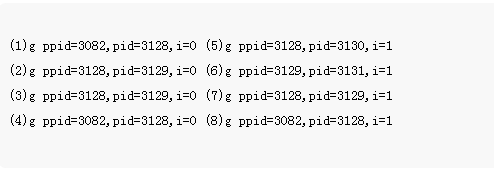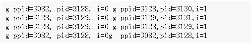 明显的,(1)和(4)是“不可能”有两个的,(2)和(3)也是,现在你知道了吧,i=0时的两个进程,在下一次fork的时候各自成为了下一个父进程,在这一次fork时,他们的信息被完全复制到了子进程,那么最后一步每一个子进程缓冲区里还存有多余的“g”(见上图)