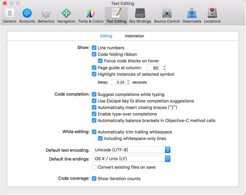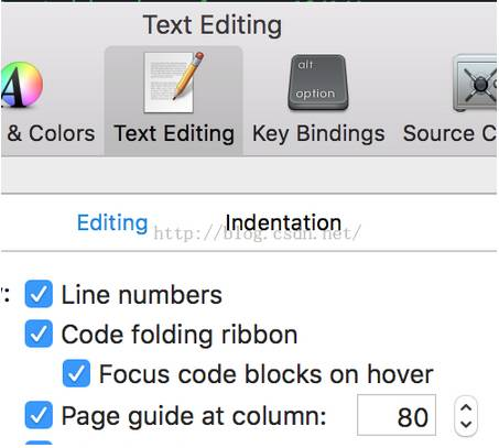 【2】任意行代码不能超过80字符。(其实也很容易超过80字符,可以考虑多行显示,比如有多个参数时,可以每个参数放一行。)可以在Xcode中设置超过80个字符的提醒,选中“Page guide at column”.设置完之后就会在代码80个字符处有一条竖线。