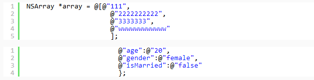 【8】长的变量值应该拆分为多行。尤其体现在使用数组或者字典。以下也分别是快速声明数组@[]和字典@{}的方法。