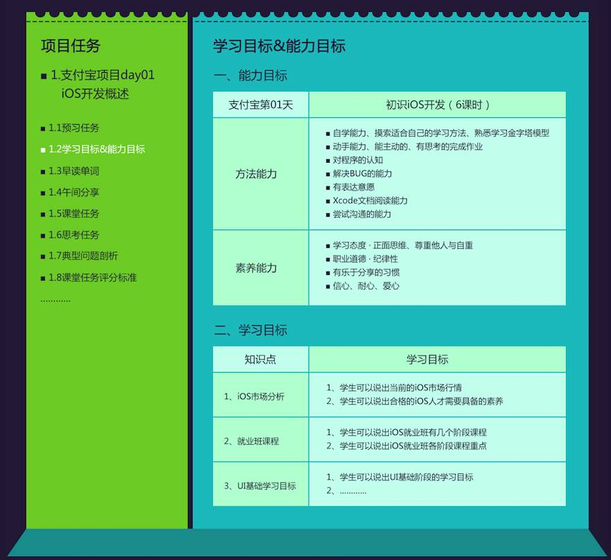 学生任务手册,让同学们清楚的知道自己学习了多少,将要学习哪些知识,这除了可以帮助同学们更好的预习复习之外,也更严格的给讲师们树立的标准,不得有一丝疏漏。