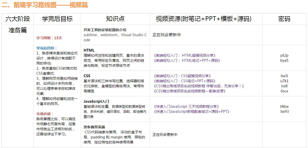 这份资源包含:学习路线图、配套视频+源码+笔记、前端工具篇、前端经验篇、前端面试篇等,资源相当充实。