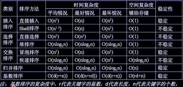 各种排序的稳定性,时间复杂度、空间复杂度、稳定性总结如下图: