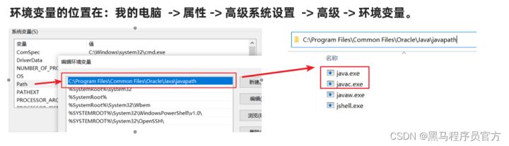 开发Java程序,需要使用JDK提供的开发工具(比如javac.exe、java.exe等命令),而这些工具在JDK的安装目录的bin目录下,如果不配置环境变量,那么这些命令只可以在bin目录下使用,而我们想要在任意目录下都能使用,所以就要配置环境变量。