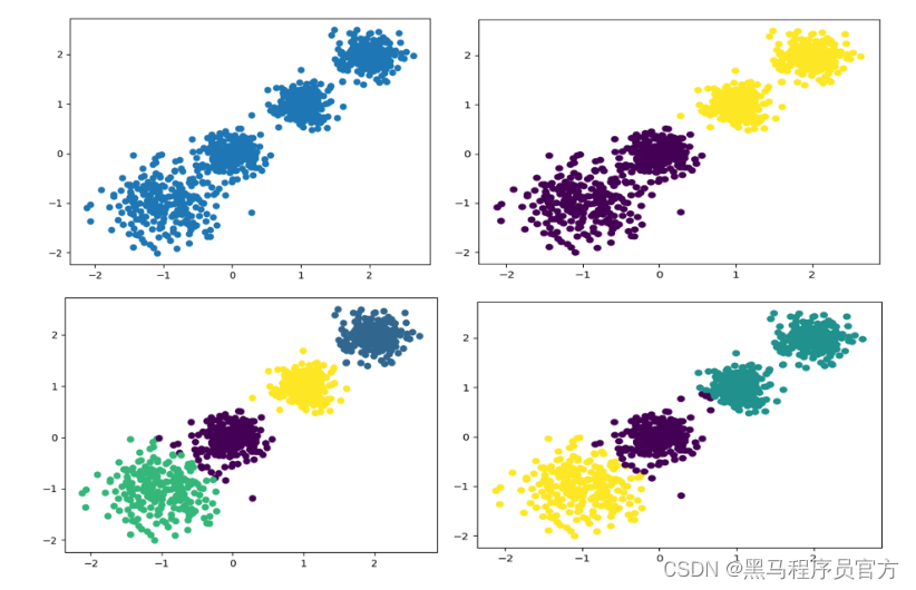 随机创建不同二维数据集作为训练集,并结合k-means算法将其聚类,你可以尝试分别聚类不同数量的簇,并观察聚类效果: