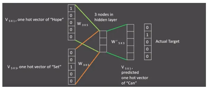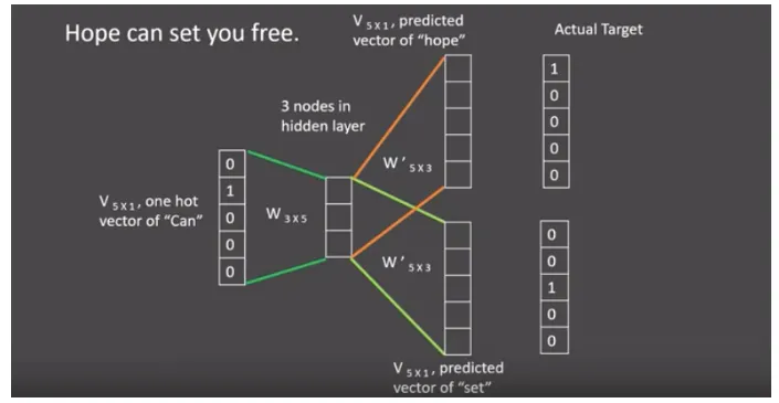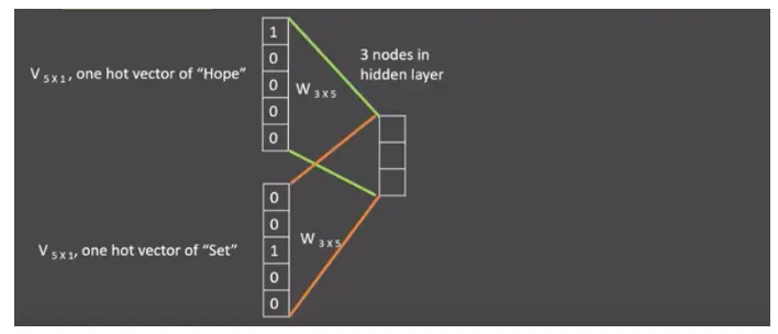 假设我们给定的训练语料只有一句话: Hope can set you free (愿你自由成长),窗口大小为3,因此模型的第一个训练样本来自Hope can set,因为是CBOW模式,所以将使用Hope和set作为输入,can作为输出,在模型训练时, Hope,can,set等词汇都使用它们的one-hot编码. 如图所示: 每个one-hot编码的单词与各自的变换矩阵(即参数矩阵3x5, 这里的3是指最后得到的词向量维度)相乘之后再相加, 得到上下文表示矩阵(3x1).