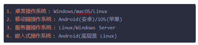 说明 : 所有硬件设备组装完成后的第⼀层软件 , 能够使⽤户使⽤硬件设备的软件 即为操作系统