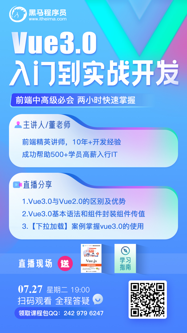 众所周知,Vue3已经在开始慢慢取代Vue2,相信在不久的将来Vue3将完全替代Vue2。今晚黑马程序员金牌讲师董老师,将为大家带来免费公开课《vue3.0入门到实战开发》。