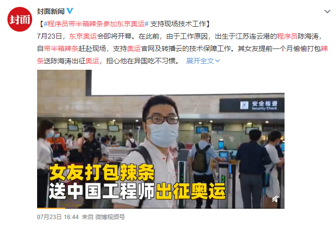 据悉,为了支持奥运会,程序员陈海涛推迟了7月的婚礼,其女友对此非常支持,但有意思的是,女友提前一个月偷偷打包半箱零食,包括酸辣粉、辣条、坚果等送陈海涛出征奥运,担心他在异国吃不习惯。