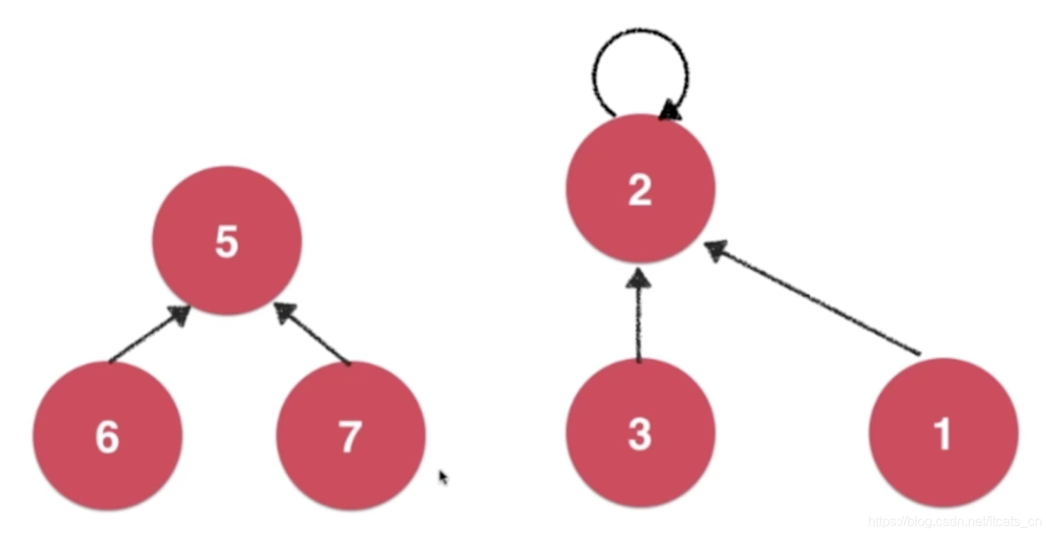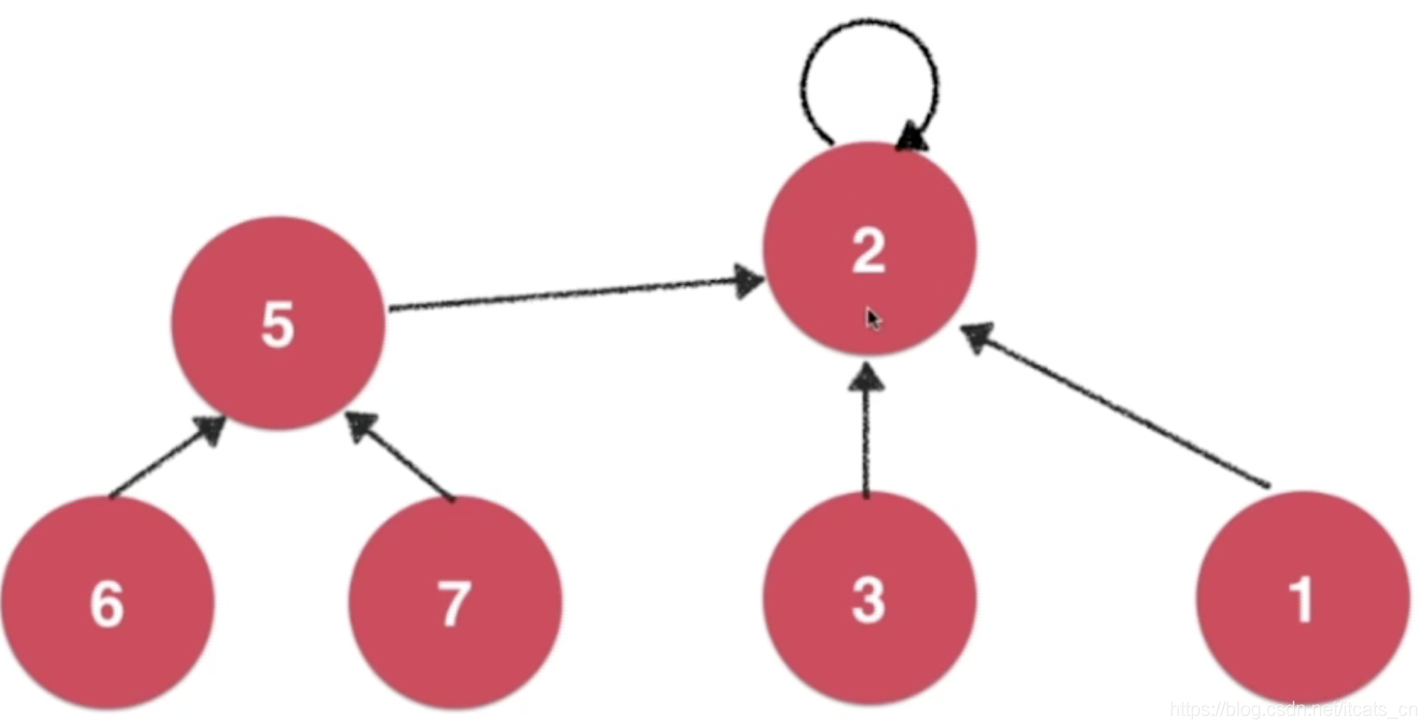 ③图中5是根节点,6和7都是5的孩子节点同时指向节点5,若想让7节点和2节点进行合并,则只需让7的根节点5指向2即可