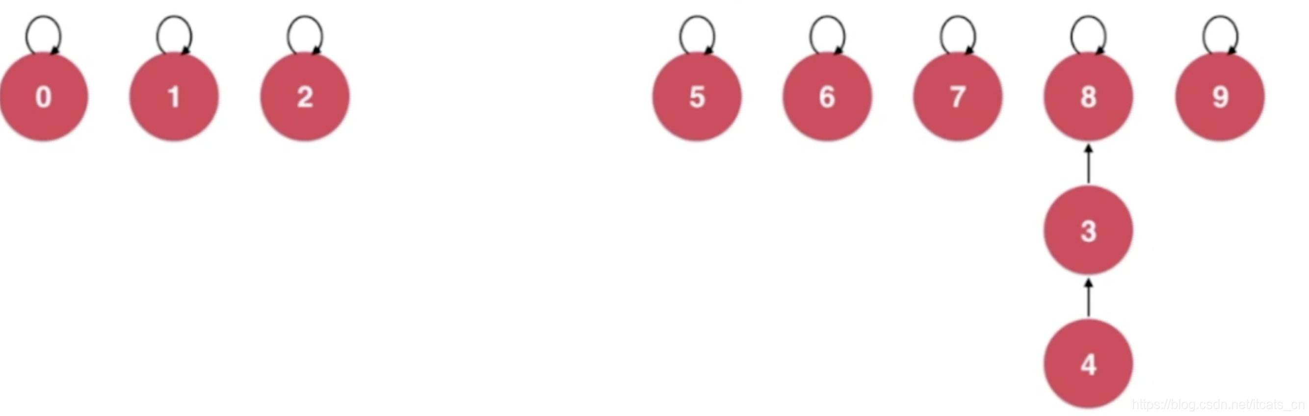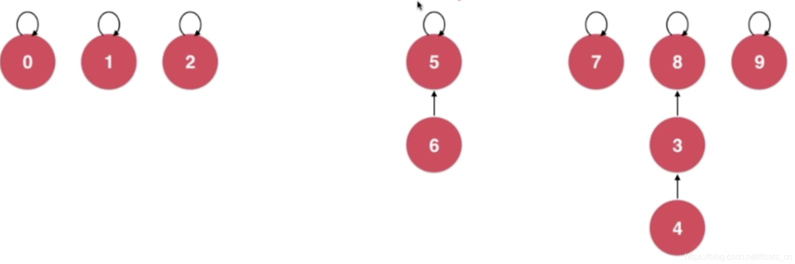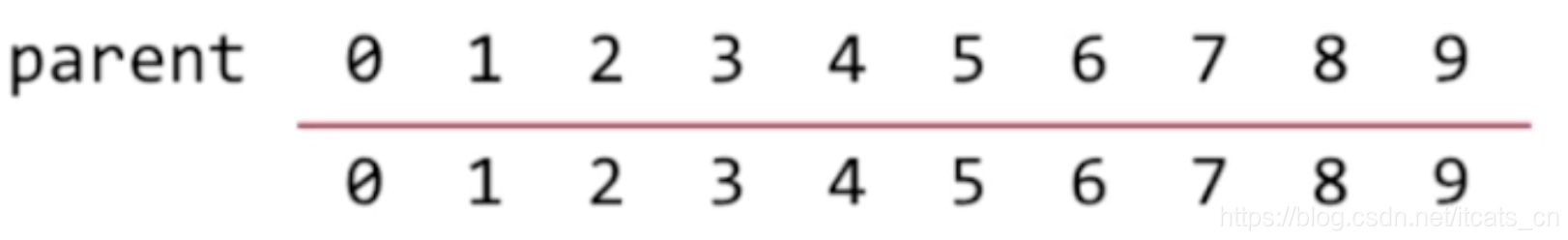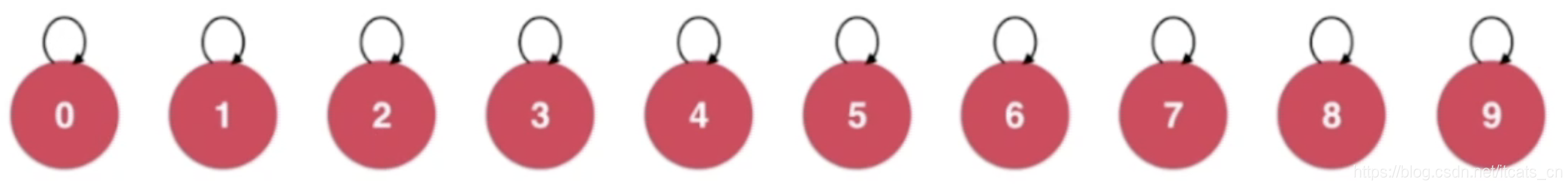 我们发现,每一个节点都只有一个指针,我们可以使用数组来表示这个指针的关系,在初始化的时候,我们让每一个节点都指向自己,如总共有10个元素: