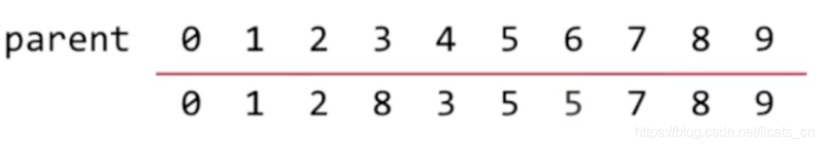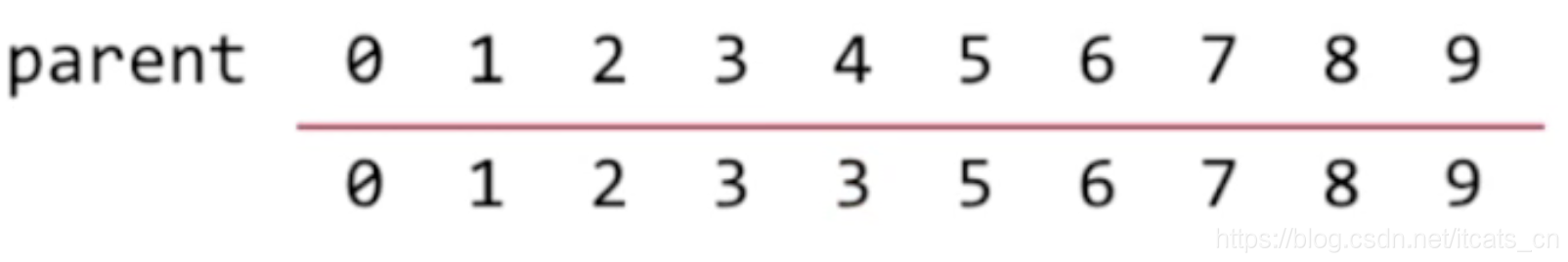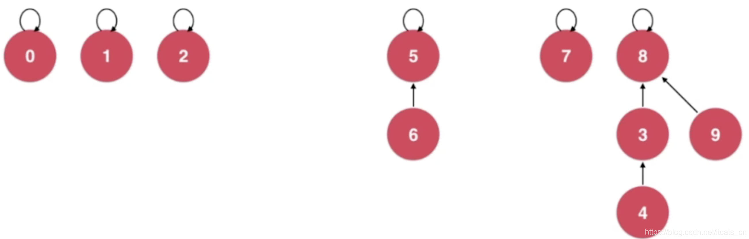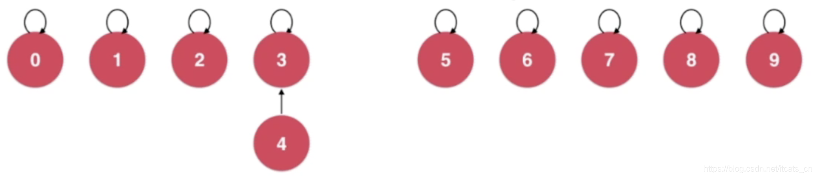 我们发现,每一个节点都只有一个指针,我们可以使用数组来表示这个指针的关系,在初始化的时候,我们让每一个节点都指向自己,如总共有10个元素: