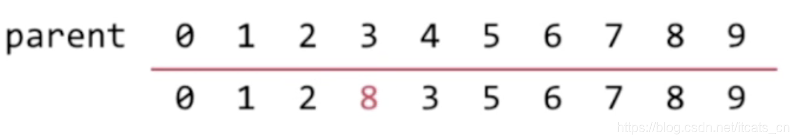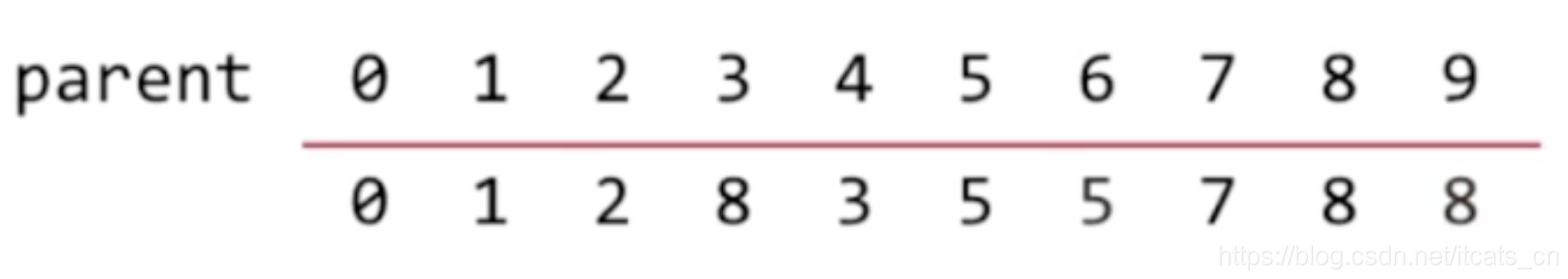 为什么我们不让节点9直接指向节点4呢?如果9指向4,实际就是生成一个链表,树的优势无法体现,现在节点9指向节点8,若我们需要查询节点9的根节点是什么?只需要一次查询即可,所以对应的数组图改变为: